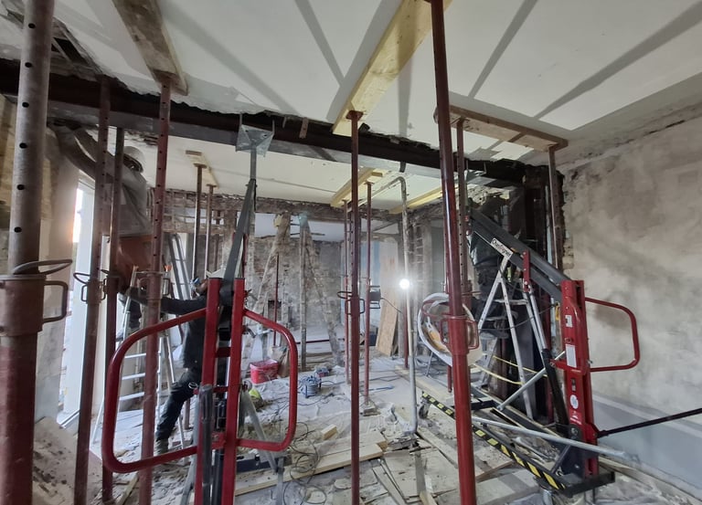 Découpe du mur porteur avec étaiement complet, gestion des charges verticales et respect des normes de sécurité. Intervention sur murs en béton, brique ou pan de bois.