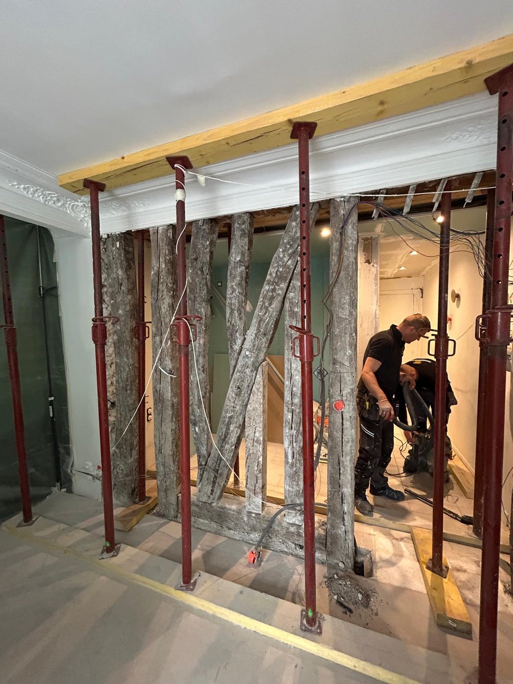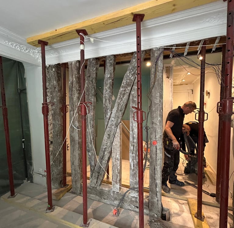 Création d’ouvertures dans murs porteurs bois, pan de bois ou ossature légère, avec maîtrise structurelle et respect de l’intégrité du bâtiment. Les travaux sont réalisés après une étude structurelle menée par notre BET Structure : analyse des entraxes, état des bois, appuis existants, étaiement adapté et découpe contrôlée du mur. Nous installons ensuite les renforts nécessaires tels que potelets, linteaux bois, ou cadres métalliques (IPN / HEB / UPN) pour reprendre les charges et garantir une stabilité durable. Ces interventions assurent une intégration parfaite dans les ouvrages existants, que ce soit pour créer une ouverture, agrandir une pièce ou aménager une circulation, tout en respectant les règles de l’art propres aux structures bois.